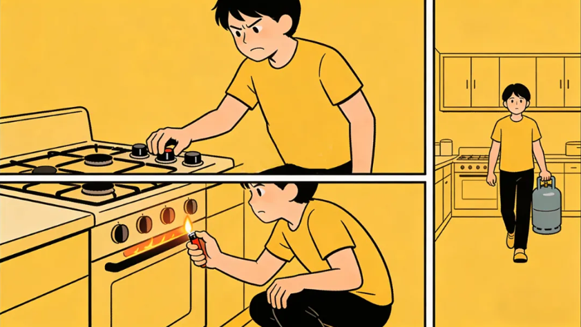 02 燃气灶打不着火时,切不可使用打火机引燃燃气。