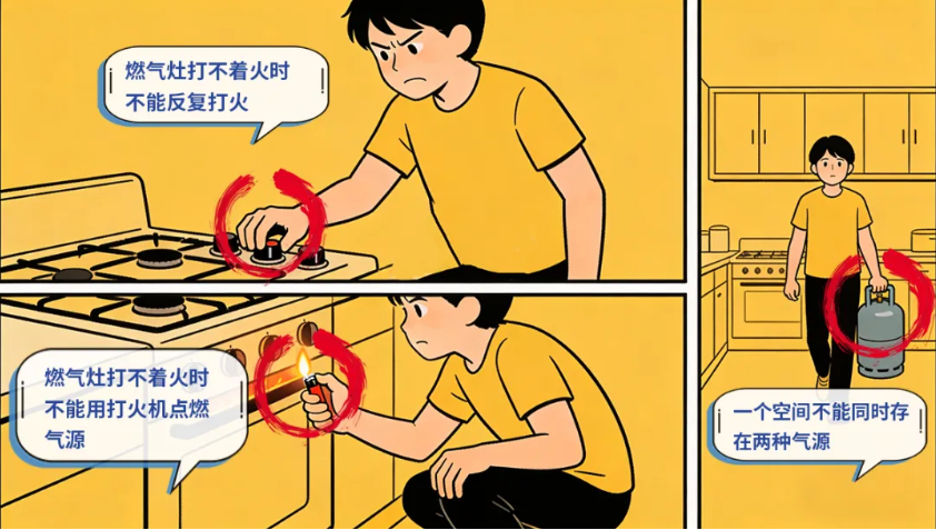 01 在使用燃气灶时,如果出现连续三次打不着火的情况,应停止打火、等待一会儿,确保天然气消散后,再重新打火。